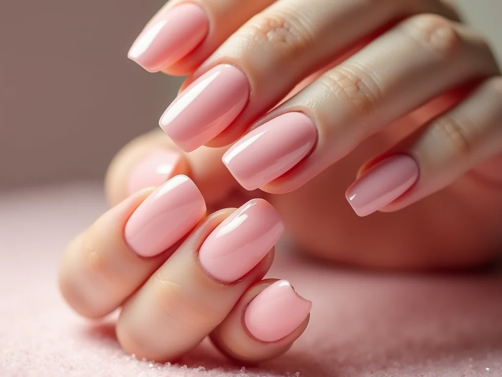 Mão com unhas de gel curtas, formato oval, com esmalte nude clássico, sobre uma base de madeira clara com textura de grãos visíveis.