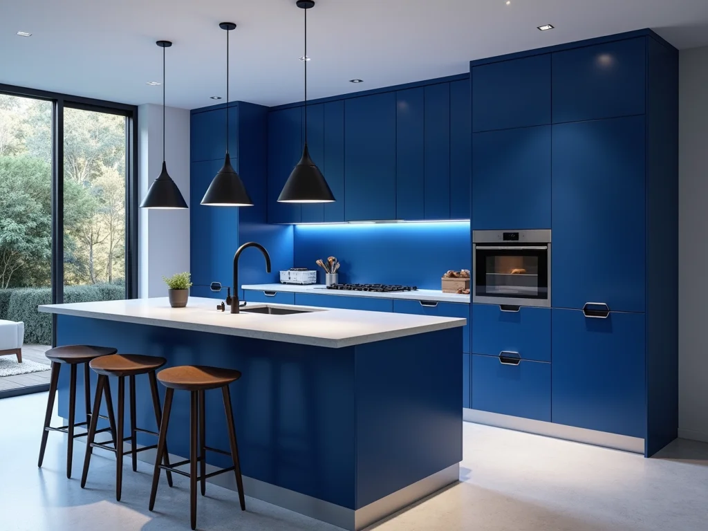 Uma parede inteira revestida com azulejos 3D em tom de azul cobalto, criando um ponto focal dramático em uma cozinha moderna.