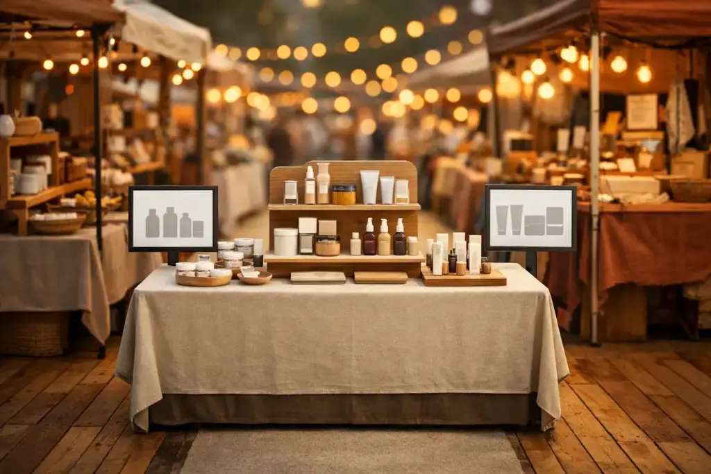 Monte um mix de produtos para feira com uma entrada, um item-estrela para demonstração e um ticket maior. Isso reduz a indecisão e organiza a conversa no estande.