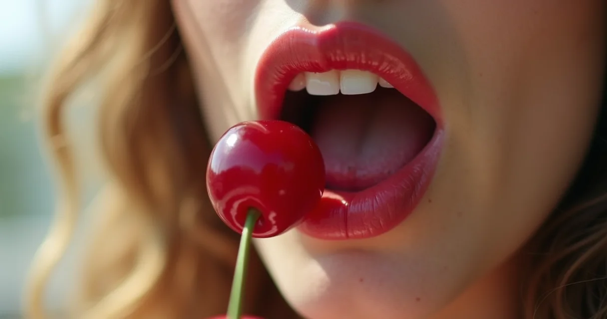 Close-up dos lábios entreabertos, com foco na textura e cor, com fundo escuro e levemente desfocado.